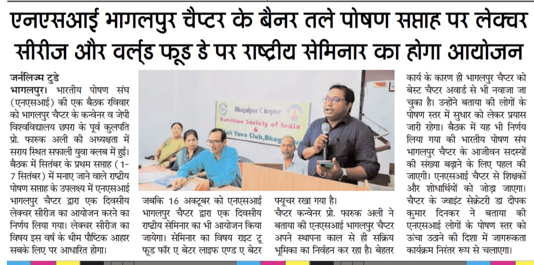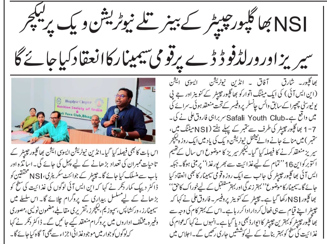 भागलपुर: भागलपुर चैप्टर एन एस आई एवं सफाली संस्थान के संयुक्त तत्वावधान में आयोजित हुई। समारोह का आरंभ सफाली बाल मंडली की राधिका एवं निधि के स्वागत गान से हुआ तथा गुलअफशा परवीन ने अतिथियों एवं भागीदारों का स्वागत किया। सेमिनार का शुभारंभ डॉ आंचल सिंह जे पी यू छपरा के पावर पॉइंट प्रेजेंटेशन के माध्यम से हुआ जिसमें उन्होंने कहा कि एनएफएचएस 4 - 5 में मां का दुध पीने वाले का बच्चों का प्रतिशत 43 है जो चिंता का विषय है। शहरी एवं देहाती माताओं में भी बहुत ज्यादा का अंतर नहीं देखा गया। उन्होंने यह भी कहा कि ब्रेस्टफीडिंग सबसे अच्छा पोषक आहार है।